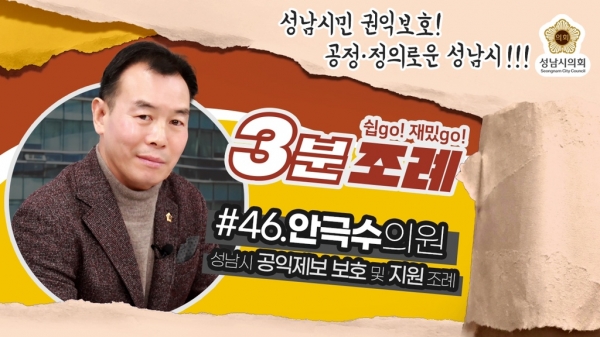 성남시의회(의장 윤창근)는 24일 ‘성남시의회 3분 조례’ 마흔여섯 번째 영상을 시의회 공식 SNS에 게시했다.이번에 소개된 조례는 안극수 의원 등 10명이 공동발의한 ‘성남시 공익제보 보호 및 지원 조례’이다.