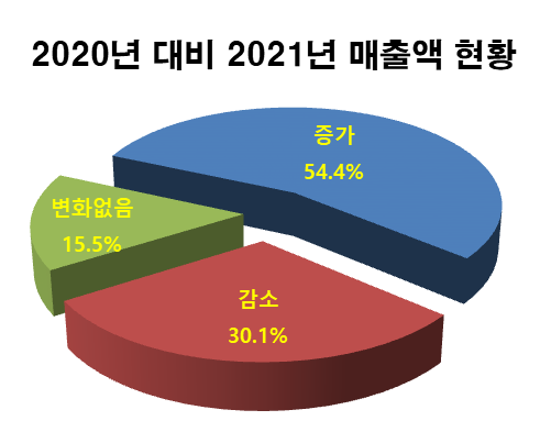 2021년 매출액이 증가한 기업은 54.4%로 코로나 시대에 대응하여 신규 사업 발굴과 다양한 판로 개척 등으로 체질이 개선된 기업과 디지털 전환과 비대면 활동이 늘어나면서 매출액이 증가한 ICT기업 등이 많은 것으로 나타났다.
