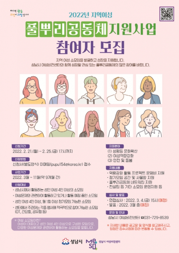 성남시 여성비전센터는 지역 여성 소모임을 발굴하고 성장을 지원하기 위해 ‘2022년 지역여성 풀뿌리공동체 지원사업’ 참여자를 모집한다.