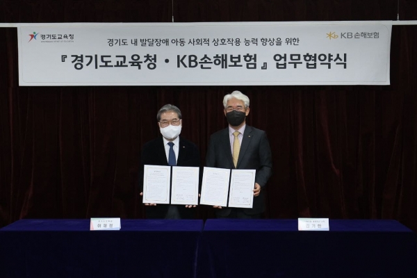 이날 협약식에는 이재정 경기도교육감과 김기환 KB손해보험 사장이 참석해 특수학교 감각통합치료실 마련과 발달장애 아동 교육 프로그램 운영 지원 등을 위한 상호 협력과 지원을 약속했다.