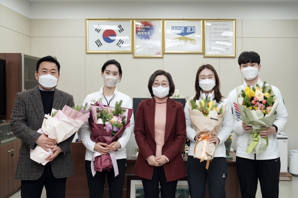 경기 성남시 은수미 시장이 23일 오전 2022 베이징 동계올림픽을 마치고 금의환향한 성남시청 직장운동부 빙상팀과 차담을 가졌다.