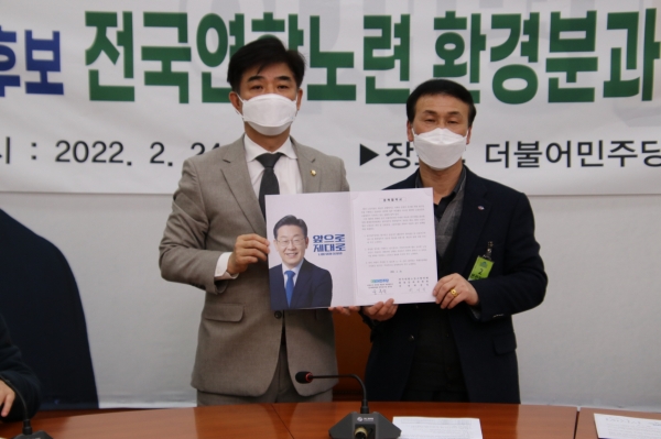 환경미화(전국연합노동조합 환경위원회)직종 전국 노동자들이 24일(목) 오전 11시 국회 본청 206호(더불어민주당 당대표 회의실)에서 더불어민주당과 정책협약식을 갖고 이재명 후보의 환경정책에 대한 지지선언을 진행했다.