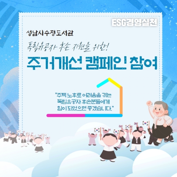 성남도시개발공사(사장 정건기, 이하 공사) 수정도서관 직원 일동은 다가오는 제103주년 삼일절을 맞이해, 한국해비타트에서 추진하는 독립유공자 후손 주거개선 캠페인 참여를 위해 해피빈 100만원을 기부했다고 28일 밝혔다.