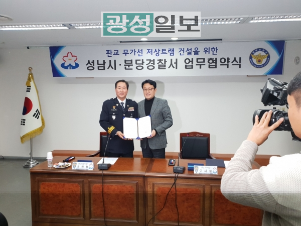 성남시(시장 은수미)는 11월 29일 분당경찰서 2층 소회의실에서 “무가선 저상트램 건설사업”과 관련한 도로 통행방안 등에 대하여 분당경찰서와 함께 상호 협력을 위한 업무협약을 체결하였다.