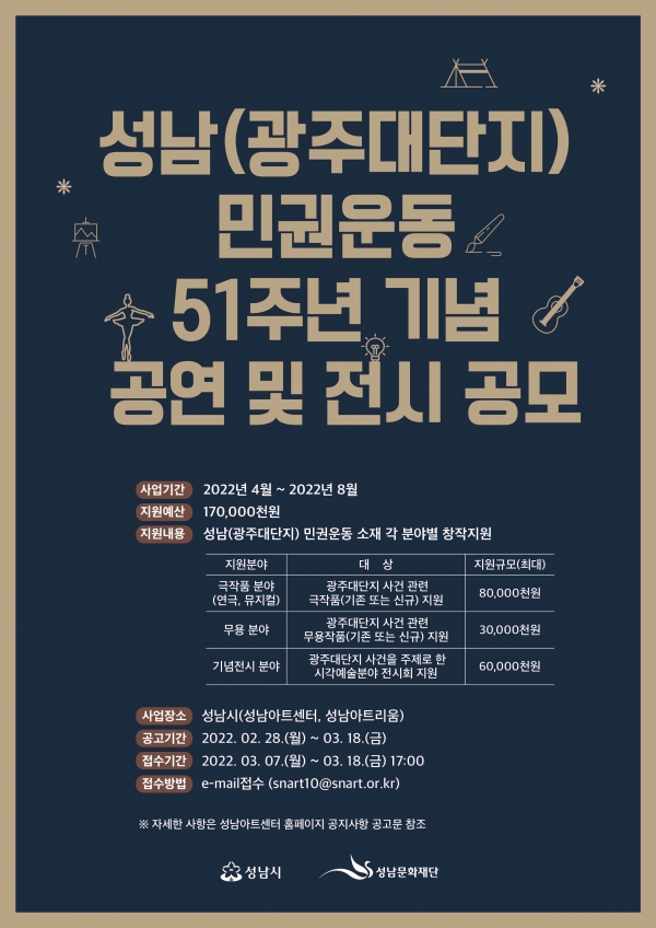 이번 ‘성남(광주대단지) 민권운동 51주년 기념 공연 및 전시 공모’는 공고일 현재 성남에 주소지를 둔 문화예술단체를 대상으로 극작품(연극, 뮤지컬)분야, 무용 분야, 기념전시 분야로 진행한다.