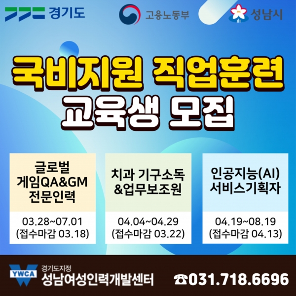 수행기관인 성남여성인력개발센터(수정구 창곡동)가 분야별 직업훈련 교육생을 모집해 관련 프로그램을 운영한다.직업 훈련 분야 중 하나는 ‘글로벌 게임 품질 검증(QA)과 운영(GM) 전문 인력’ 과정이다. 게임 업계 취업을 희망하는 성남시 거주 미취업 청년(만 34세 이하) 20명을 오는 3월 18일까지 모집해 직업훈련을 한다. 교육 내용은 게임분석과 마케팅, 게임 기획과 실습, 게임테스트, 빅데이터 분석, 현장 전문가 멘토링 등이다. 오는 3월 28일부터 7월 1일까지 총 67일(469시간) 과정의 교육을 수료하면 최대 38만원의 훈련수당을 지급한다.