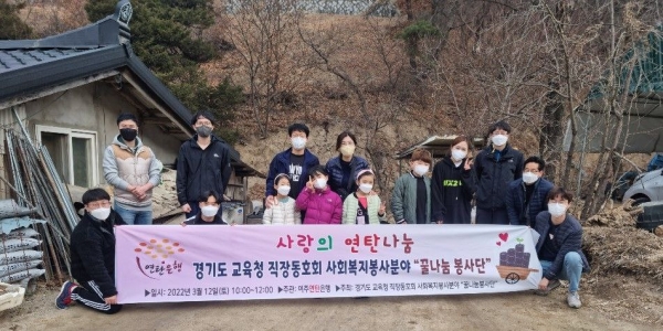 경기도교육청(교육감 이재정) 직장 동호회‘꿀나눔 봉사단’이 12일 여주지역 소외 계층 가정에 연탄 나눔을 실시했다고 밝혔다.이날 나눔에는 봉사단 회원, 도교육청 소속 직원과 자녀 20여 명이 참여해 모두 1,875장의 연탄을 배달했다.