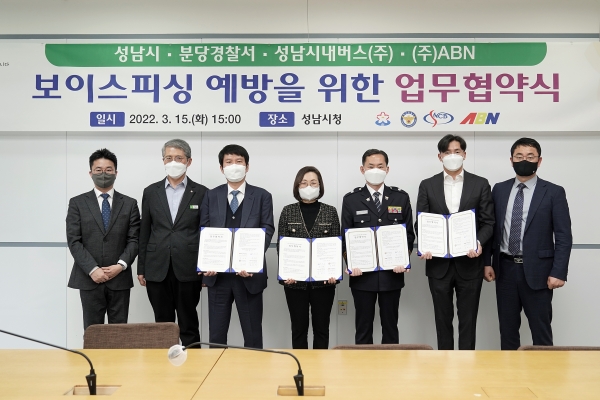최근 보이스피싱이 사회문제로 대두되고 있는 가운데 범죄로부터 시민들의 재산을 보호하고 예방하기 위하여 성남시(시장 은수미)와 분당경찰서(서장 김수영)는 관내 시내버스업체인 ㈜성남시내버스(대표 김윤태), 지역방송인 ㈜ 아름방송네트워크(대표 박상영)와 함께 손을 잡고, 3월 15일(15:00) 성남시장실에서 은수미 성남시장과 김수영 분당경찰서장 등이 참석한 가운데 협약을 체결했다.