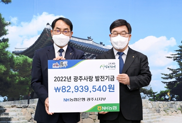 NH농협은행 광주시지부는 15일 광주시청을 방문, 지난 한 해 동안 모은 광주시 제휴카드 적립 기금을 전달했다.제휴카드 적립기금은 광주사랑카드 및 보조금 카드 이용에 따라 0.5%∼1.0%의 비율로 적립된 금액이다.