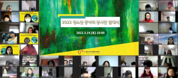 (재)용인시자원봉사센터는 청소년 자원봉사 활성화와 자기주도형 봉사문화 형성을 위한 2022 용인시 청소년동아리봉사단의 발대식을 코로나19 대유행 상황에서 봉사자의 건강과 안전을 고려해 3월 19일 온라인으로 개최했다.