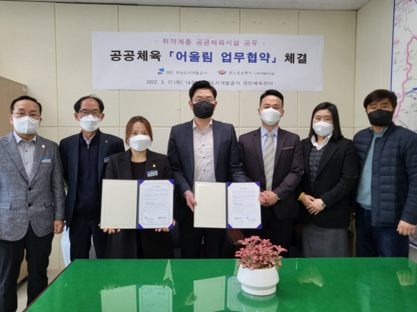 성남도시개발공사(사장 정건기, 이하 공사)에서 운영하는 국민체육센터는 WE스포츠복지 사회적 협동조합(이사장 민경한)과 취약계층 어울림 공공생활체육 지원사업을 위한 업무협약을 체결했다고 21일 밝혔다.