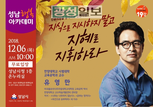 성남시는 한양대 사범대학 교육공학과 유영만 교수를 초빙해 오는 12월 6일 오전 10시 시청 온누리에서 성남행복아카데미 열아홉번째 강연을 연다.이 날 강연의 주제는 ‘지식으로 지시하지 말고 지혜로 지휘하라’이다.