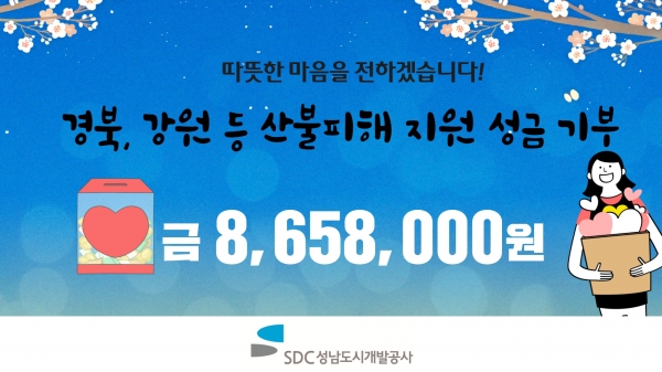 성남도시개발공사(사장 정건기, 이하 공사)는 ‘사회복지공동모금회 경북·강원 등 산불 피해 지원 모금캠페인’에 동참해 성금 865만8000원을 기부했다고 28일 밝혔다.
