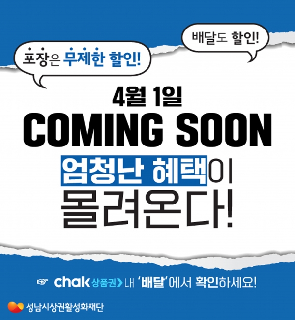 시 출연기관인 성남시상권활성화재단이 오는 4월 1일부터 성남사랑상품권 통합플랫폼인 ‘착(chak)’ 앱을 통해 2만원 이상 배달 주문 또는 매장 포장 주문을 하는 이들에 7000원의 모바일 할인 쿠폰을 제공하는 방식이다.총 1억4700만원 상당이며, 쿠폰 2만1000여 장이 소진될 때까지 이벤트가 열린다.
