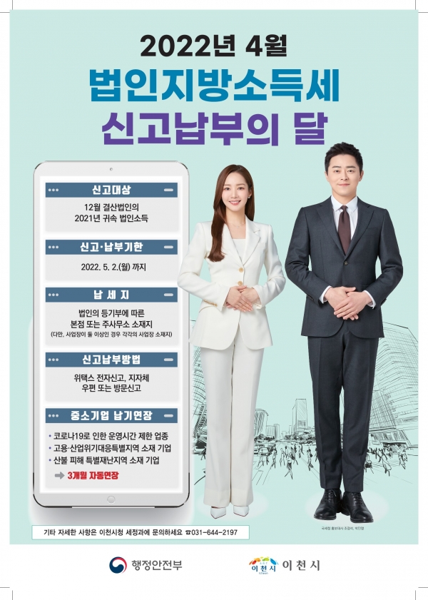 이천시는 지역 내 사업장을 두고 있는 12월 결산법인의 2021년 귀속 사업연도 소득에 대한 법인지방소득세를 오는 5월 2일까지 확정 신고‧납부해야 한다고 밝혔다.