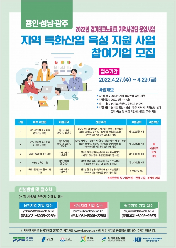 이 사업은 지역 기반 첨단정보통신(ICT)·소프트웨어(SW), 공예·문화 등의 분야에서 유망기업과 창업기업을 육성하기 위해 성남시와 경기도, 경기테크노파크, 단국대 산학협력단이 협력 추진한다.