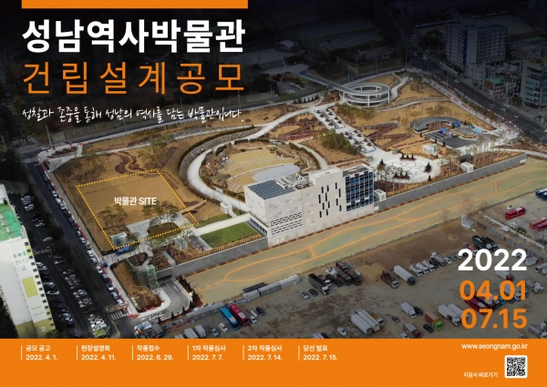 공모 일정은 ▲4월 1일~29일 입찰 참가 등록 ▲4월 11일 성남1공단 근린공원에서 현장 설명회 ▲4월 30일~6월 29일 설계 작품 접수 등의 순이다. 당선작 발표일은 오는 7월 15일이다.성남역사박물관은 전시동과 교육동으로 구성된다.