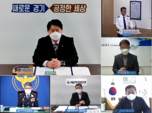 이날 협약식은 코로나19 상황을 고려해 비대면 화상회의 방식으로 진행됐으며, 이한규 경기도 행정2부지사, 김남현 경기도북부경찰청장, 김정희 서울지방국토관리청장, 송준규 도로교통공단 경기도지부장, 정관목 한국교통안전공단 경기북부본부장 5개 기관 대표가 서명자로 참여했다.