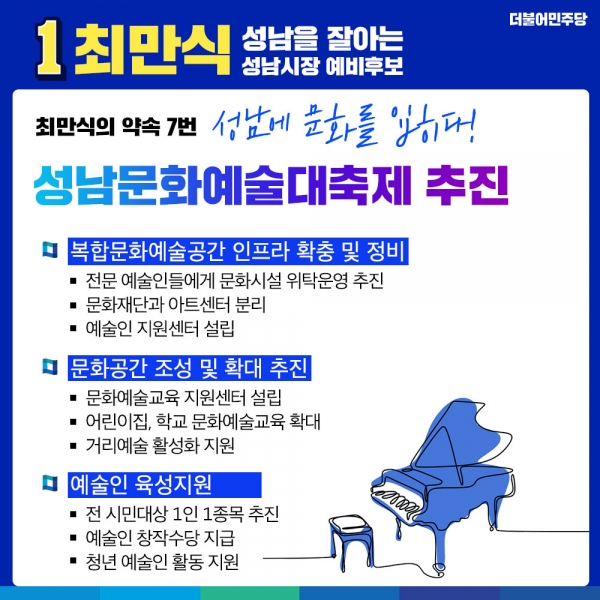 최만식 예비후보는 성남을 대표하는 축제를 준비하는 ‘성남문화예술대축제’를 추진하겠다고 발표하였다. 현재까지 성남을 대표하는 축제가 없는 현실에서, 3년간 문화예술 역량을 축적해 성남의 대표축제를 준비하고 만들 것을 제시하였다. 이를 위해 다음 세 가지 방향 사업을 추진하겠다고 발표하였다.