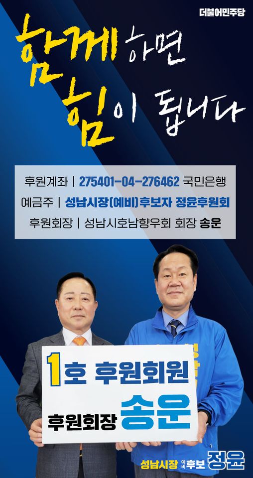 더불어민주당 정윤 성남시장 예비후보가 12일 자신의 후원회장으로 송운 성남시 호남향우회장을 모셨다고 밝혔다.