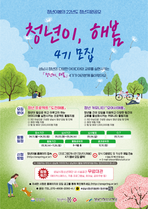 성남시청소년재단(대표이사 진미석) 성남시청년지원센터의 청년활동지원 공모사업『청년이, 해봄』이 4. 11.(월)부터 사업 참여자 모집을 개시했다.