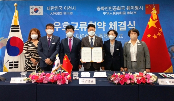 경기도 이천시가 17일 중국 웨이팡시와 우호교류협약을 체결하고 공동 번영과 발전을 약속했다.온라인 화상회의로 열린 이날 협약식에는 이천시 관계자와 웨이팡시 류윈 시장을 비롯한 시 간부 공무원들이 자리에 함께했으며, 싱하이밍 주한 중국 대사와 주칭다오 대한민국 총영사관 김경한 총영사 등이 영상으로 축하인사를 전했다.