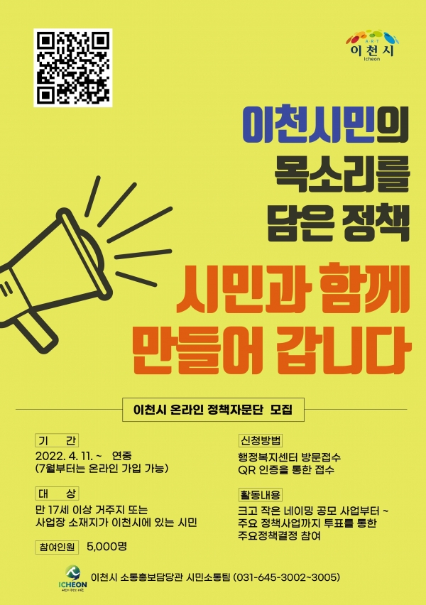 이천시는 이천시민의 정책참여 기회를 확대하기 위한 이천시 온라인 정책자문단을 5,000명 모집한다.신청자격은 이천시에 거주하거나 사업장 소재지가 이천시에 있는 만17세 이상의 시민이며, 신청방법은 이천시청 공식 홈페이지 또는 이천시 블로그를 통해 신청서를 작성하여 제출하거나 홍보 포스터의 QR코드 인증 또는 읍면동에 방문접수하면 된다.