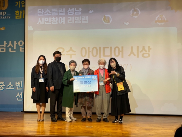 성남시 중원노인종합복지관(관장 신명희) 공동체 건강지킴이가 성남시와 성남산업진흥원에서 주최하는 「탄소중립 성남」 시민참여 리빙랩에서 4월 15일(금) 탄소중립을 메인 주제로 기후·환경분야로 선정되어 등급심사의 과정을 통해 ‘특별상’의 영예를 안았다.