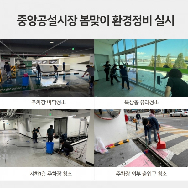 공사는 4월 11일부터 4월 18일까지 8일 간, 중앙공설시장 공영주차장 내부 바닥 청소를 통한 주차구획선 시인성 확보, 내부 통행로(계단실 등) 논슬립 등 점검 및 벽면 오염부 제거, 외곽주변 대상으로 쓰레기 청소, 기계 전기시설물 및 기자재 점검 등을 통해 시민이 더 편리하게 시설을 이용할 수 있도록 했다.