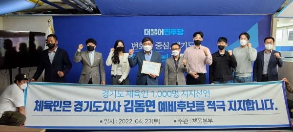 경기도체육인 10여명은 23일 오전 11시 수원시 지동에 위치한 김동연 캠프 선거사무소에서 ‘지지선언식’을 갖고, 경기도 체육인 1천여명의 서명이 담긴 지지선언서를 캠프 측에 전달했다.