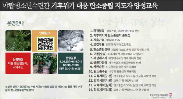 성남시청소년재단(대표이사 진미석) 분당야탑청소년수련관은 다음 세대를 위한 탄소중립 사회로의 기축역할을 다하고자 기후 위기의 시대, 주도적인 기후 행동을 이끌어갈 시민들을 대상으로 「탄소중립·SDGs 실천 지도자 양성 교육」을 실시한다고 밝혔다.