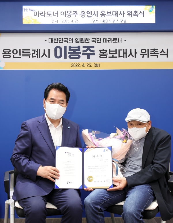 용인시가 25일 국민 마라토너 이봉주를 시 홍보대사로 위촉했다.이날 홍보대사 위촉은 백군기 용인시장이 이봉주(전 마라톤 선수)에게 직접 제안하면서 이뤄졌다.