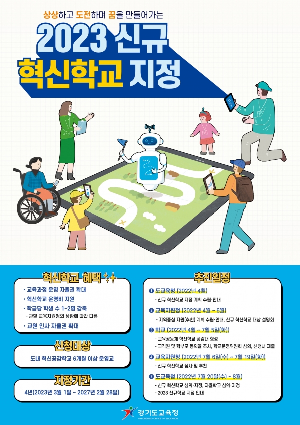 도교육청은 지역교육지원청이 혁신학교 운영 신청교를 대상으로 심사・심의・추천한 내용을 경기도혁신학교위원회에서 종합 심의해 신규 혁신학교를 오는 8월 안에 최종 지정할 예정이다.혁신학교 지정은 4년 단위로 운영해 2023년 3월 혁신학교를 시작하는 학교는 2027년 2월까지 모든 학생의 배움과 성장을 위해 민주적 학교문화를 기반으로 창의적 교육과정을 운영하게 된다.