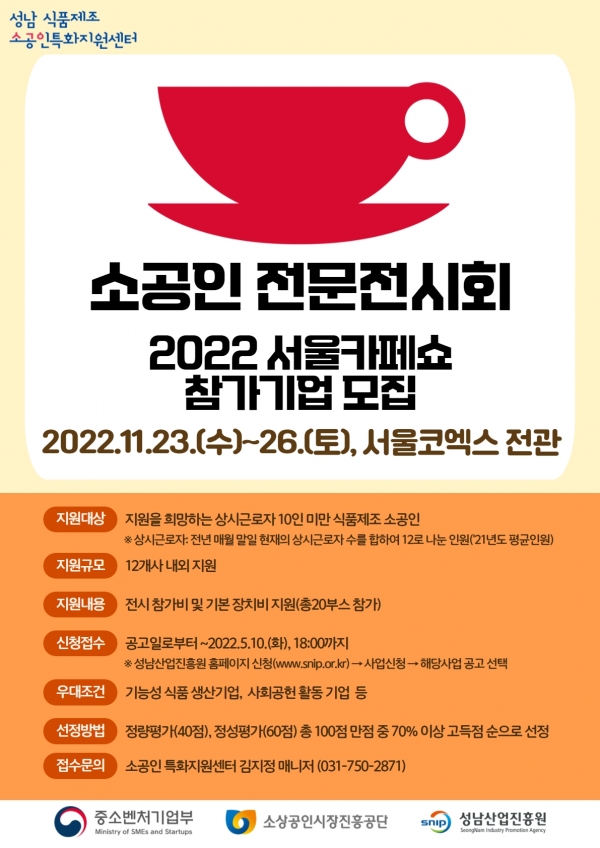 성남산업진흥원은 오는 5월 10일까지 성남시 관내 상시근로자 10인 미만의 소공인 대상으로 판로개척과 산업의 동향 파악을 위해 “소공인 전문전시회(서울 카페쇼) 참가지원” 사업 참여기업을 모집한다고 밝혔다.