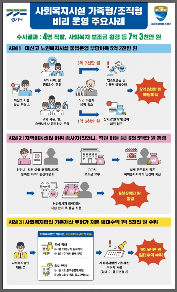 김영수 경기도 공정특별사법경찰단장은 27일 경기도청에서 기자회견을 열고 “지난 1월부터 3월까지 사회복지시설 가족형/조직형 비리 기획 수사 결과 불법행위가 적발된 사회복지시설 등 3곳과 이 시설의 시설장 등 4명을 적발했고 수사가 마무리되는 대로 검찰에 송치할 계획”이라고 말했다.이들이 보조금을 횡령하거나 부당이득으로 수취한 금액은 총 7억3천만 원에 달한다.