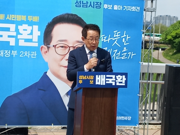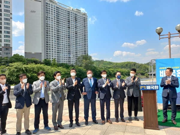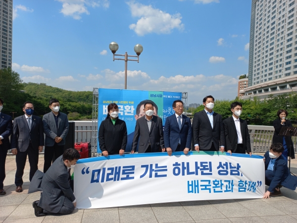 더불어민주당 배국환 성남시장 후보가 5월 2일(월) 오후 2시, 성남시 분당구 정자동 백궁교 위에서 출마 기자회견을 진행했다.배국환 후보는 출마기자회견에서 “기자회견을 진행하는 이 곳은 18년간 살았던 저의 삶의 터전이며 주민들을 이어주는 다리로 큰 의미가 있다”며 출마선언 장소를 선정한 의미를 강조하였다.