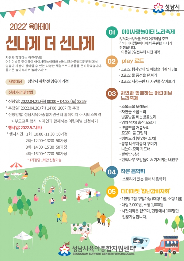 성남시육아종합지원센터에서는 ‘자연과 함께하는 어린이날’을 주제로 부모(양육자)와 자녀가 행복한 놀이 경험을 할 수 있는 육아데이 ‘신나게 더 신나게’ 가족참여행사를 개최한다고 밝혔다.