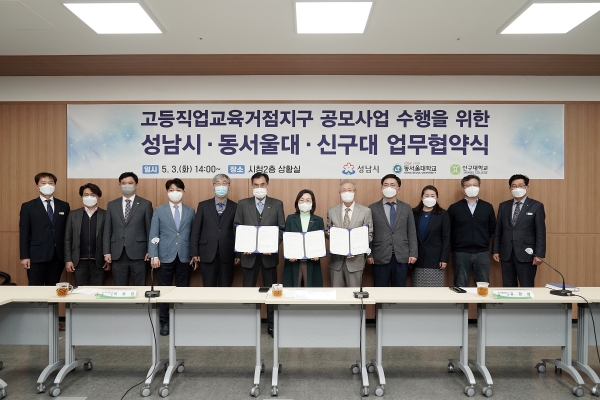 성남시(시장 은수미)는 5월 3일 오후 2시 시청 상황실에서 ‘고등직업교육거점지구 공모사업(이하, HiVE사업)’을 추진하기 위해 동서울대학교(총장 유광섭), 신구대학교(총장 이숭겸)와 업무협약을 체결했다.