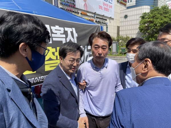 오늘(5월 5일) 야탑역 광장에서 더불어민주당 전략공천 철회를 요구하며 11일째 단식농성을 이어가던 조신 전 예비후보에게 김동연 경기도 지사 후보가 전격 방문했다.