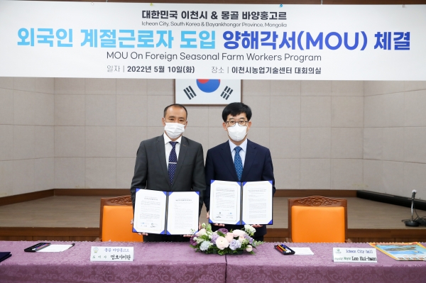 이천시는 농번기 농업인력 부족현상을 해결하기 위하여 5월 10일 농업기술센터 대회의실에서 이의환 부시장과 몽골 바양홍고르 아이막시장(도지사)이 참석하여 외국인 계절근로자 업무협약(MOU)을 체결했다.