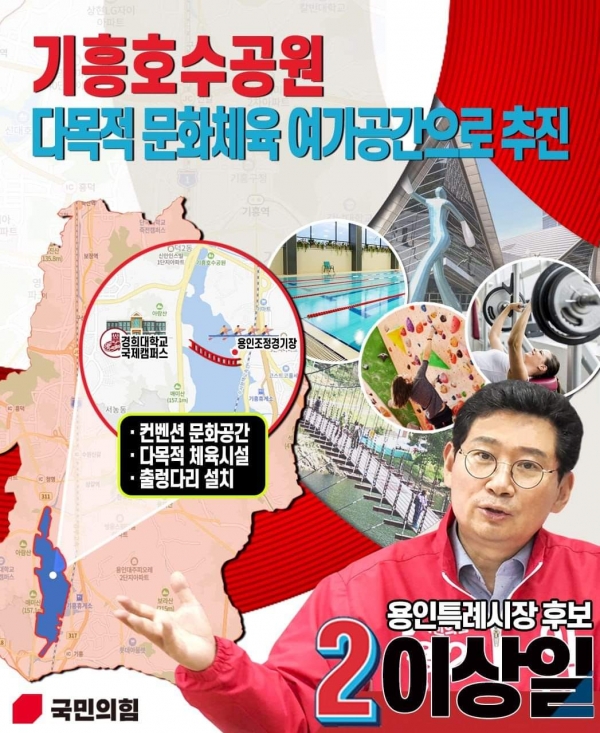 이상일 국민의힘 용인특례시장 후보가 용인시 기흥구에 위치한 ‘기흥호수’를 시민들을 위한 공간으로 새롭게 조성하여, 용인시민들이 여가활동을 즐기고 다양한 문화행사를 향유할 수 있는 용인시의 새로운 명소로 만들겠다고 시민들에게 약속했다.