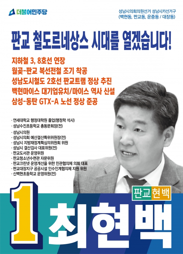 한편 현 성남시의원이며 연세대학교 행정대학원 행정학석사 출신인 최현백후보는 “지난 4년간 삼평동 641번지 첨단기업 유치, 판교트램, 월판선 조기 착공, 백현마이스 추진을 위한 산자부 전시발전심의위원회 통과, 10년 공공임대 분양전환가 개선 등을 위해 함께 고생해온 김병관 국회의원 후보와 김승용 경기도의원 후보 그리고 기재부 차관 출신의 예산, 행정전문가 배국환 성남시장 후보와 유기적 협업을 통해 판교와 성남의 백년대계를 견인하겠다”라고 6.1 지방선거 포부를 밝혔다.
