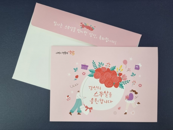 은 시장은 카드에 “인생에 단 한 번뿐인 여러분의 아름다운 스무살을 진심으로 축하합니다. 코로나19와 마스크로도 결코 가려지지 않는 스무살의 사랑, 열정, 도전이 있어 성남시는 희망이 있습니다. 언제 어디서든 항상 응원하겠습니다”라고 적었다.카드에는 최민정 쇼트트랙 선수 등 7명의 축하 영상(6분 41초 분량)을 볼 수 있는 QR코드도 삽입했다.