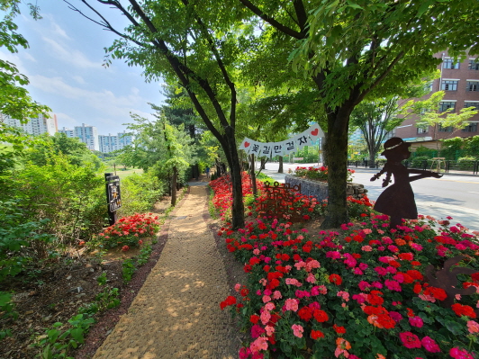 기존 단조로웠던 산책로에서 공간별 맞춤 가랜드 설치로 희망 메시지를 전하고, 계절꽃 식재, 철제조형물 등 다양한 볼거리 제공과 노후 화단 및 토사유실 정비를 통해 쾌적하고 안전한 산책로로 재탄생 되었다.