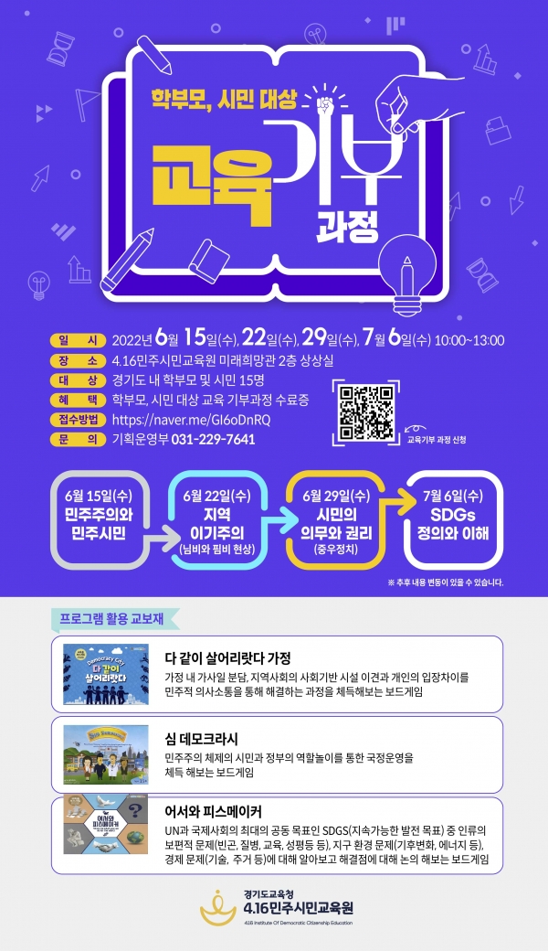 4.16민주시민교육원(원장 전명선)이 23일부터 도민을 대상으로 ‘교육 기부 과정’ 참가 신청을 받는다.이번 프로그램은 미래세대가 민주시민으로 성장할 수 있도록 학부모 등 도민이 교육에 참여할 기회를 제공하고자 교육원에서 마련했다.