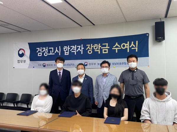법무부 성남보호관찰소(소장 김종말)는 2022. 5. 23.(월) 성남시청 4층 성남보호관찰소 임시행정 사무소 회의실에서 제1회 검정고시에 합격한 보호관찰 청소년들을 격려하고, 더 큰 목표에 도전할 수 있도록 ‘검정고시 합격자에 대한 장학금 수여식’을 개최했다.