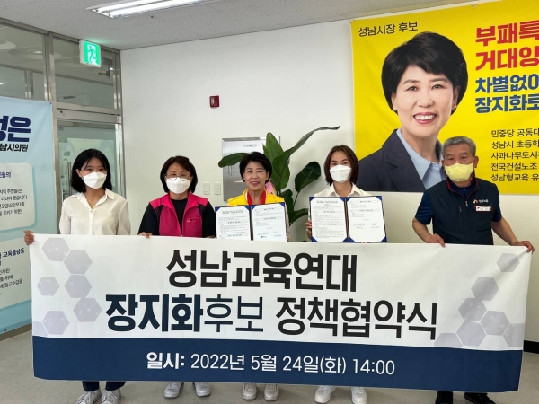 진보단일후보 장지화 성남시장 후보는 성남교육연대(상임공동대표 박은주 박만준 박화자 신수연)는 24일 장지화 후보 선거사무소에서 정책협약식을 진행했다.