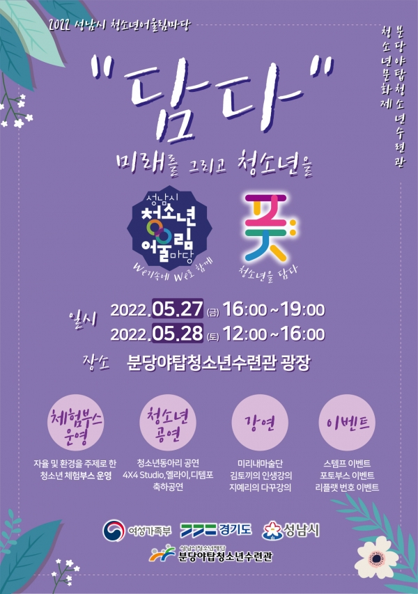 성남시청소년재단(대표이사 진미석) 분당야탑청소년수련관에서 오는 27일과 28일,5월 청소년의 달과 분당야탑청소년수련관 개관 1주년을 기념하기 위해 성남시청소년어울림마당‘미래를 담다’와 청소년문화제 ‘청소년을 담다’를 개최한다.