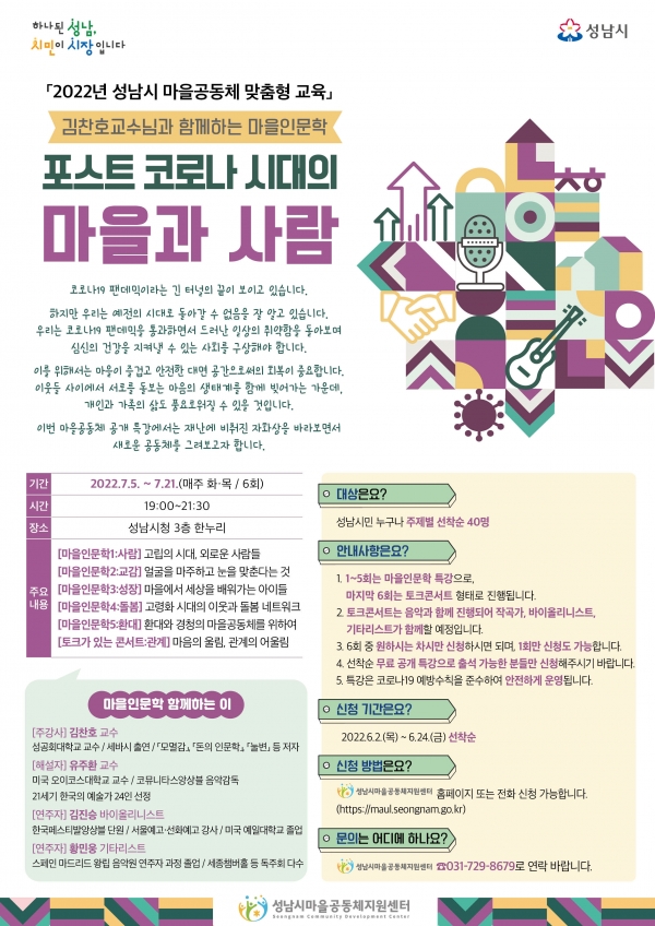 성남시는 오는 7월 5일부터 마을공동체 공개 특강(포스트 코로나 시대의 마을과 사람)을 진행한다.