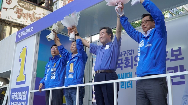 이날 서현역 AK프라자 앞 유세장에 도착한 이낙연 전 대표는 배국환 성남시장 후보, 김병관 분당갑 국회의원 후보와 함께 현장 유세를 진행했다. 많은 당원과 지지자가 참석한 가운데 이낙연 전 대표는 후보들과 두 손을 번쩍 들며 이에 화답하기도 했다.